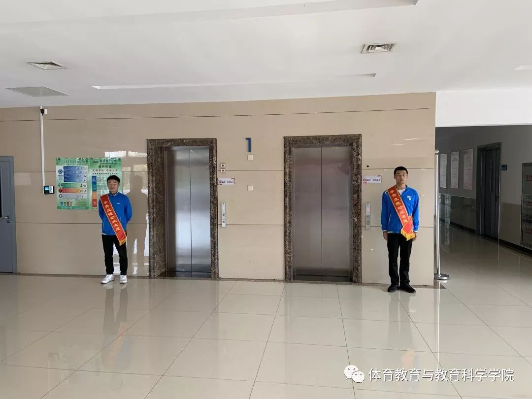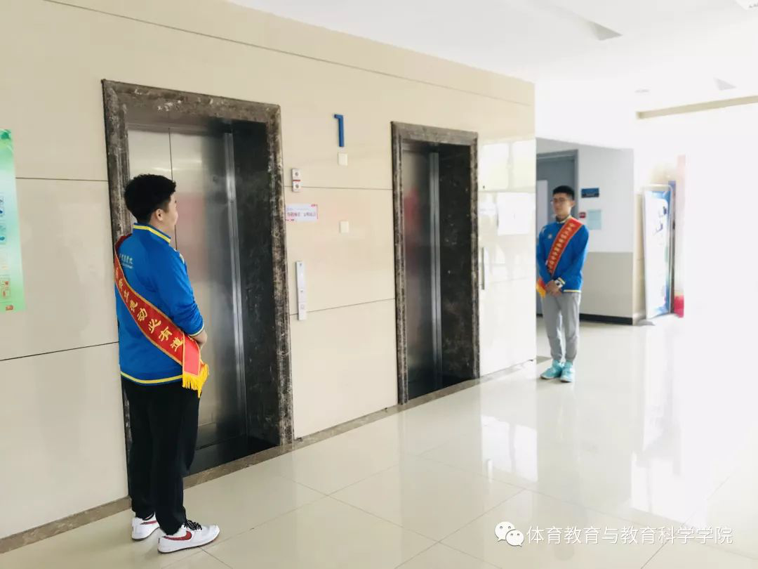 在教学楼,课前、课间、课后安排同学在电梯旁维持秩序,劝导并制止嬉戏打闹、吸烟等不文明行为,劝导同学们乘坐电梯文明排队并礼让老师优先乘坐电梯。