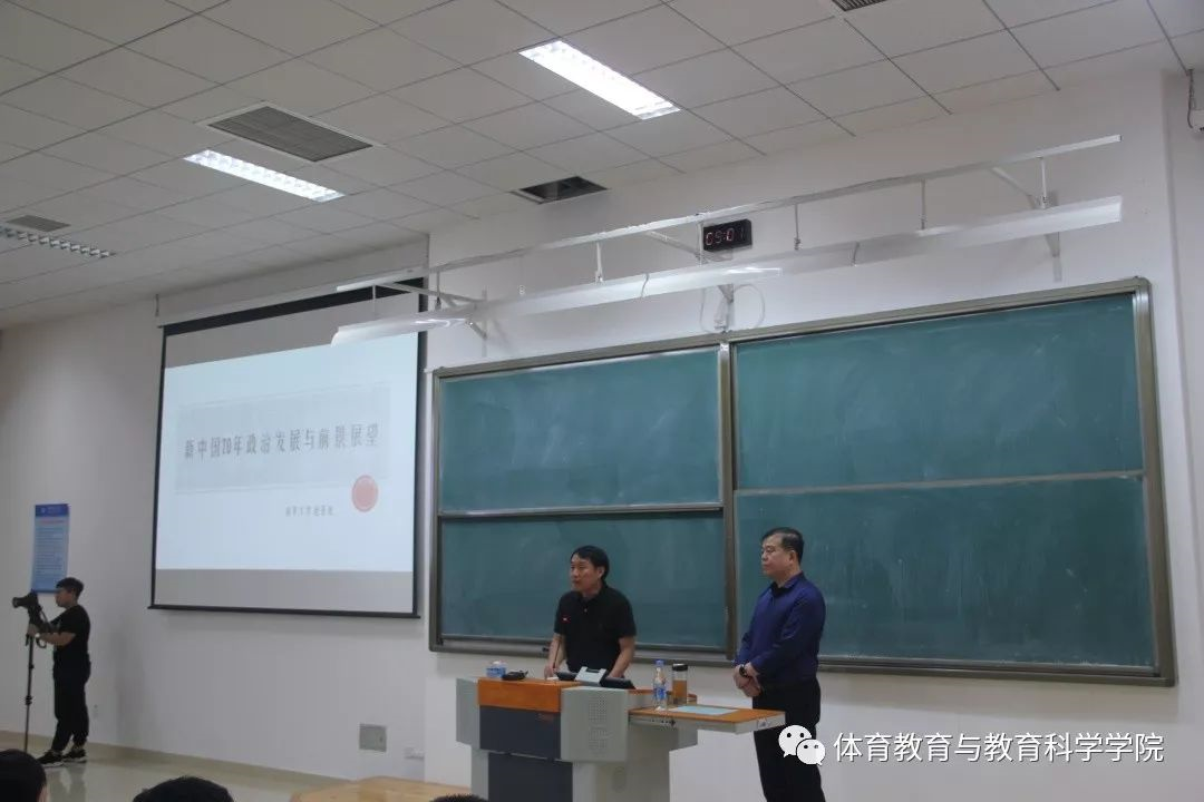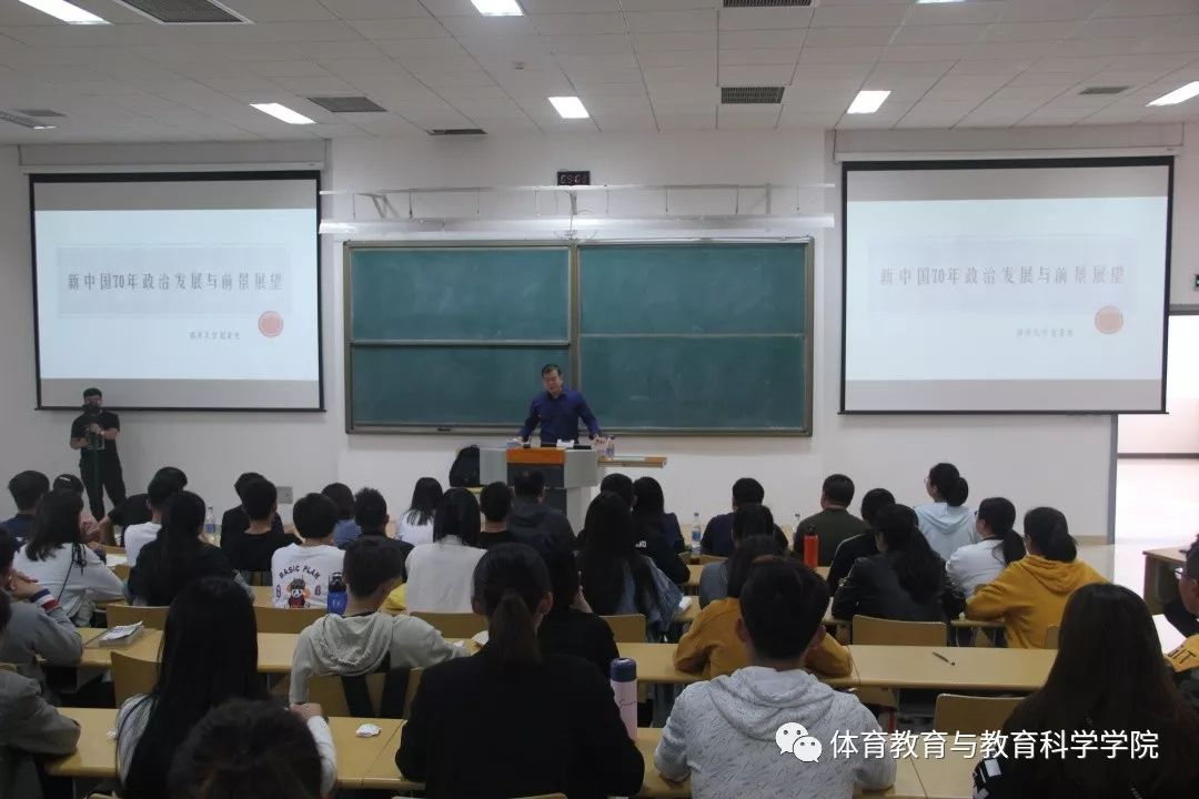 研究生新生养成计划讲座之“我与祖国共成长”新中国成立70周年报告会在教学楼B214举行,天津思政课教授宣讲团成员、南开大学马克思主义比分网