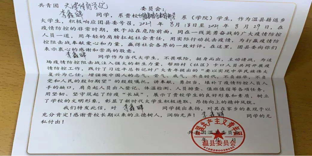 李鑫皞同学表示:在暑假做志愿期间,感受到了中国广大人民劲往一处使的责任感和使命感,越来越多的人参与到志愿服务中来,我对此非常感动。作为一名新时代大学生预备党员,我积极向老一辈党员同志看齐,同站在疫情防控前线的工作者并肩,为家乡奉献爱心和力量,不断践行“全心全意为人民服务”的宗旨,努力做一名优秀的共产党员。