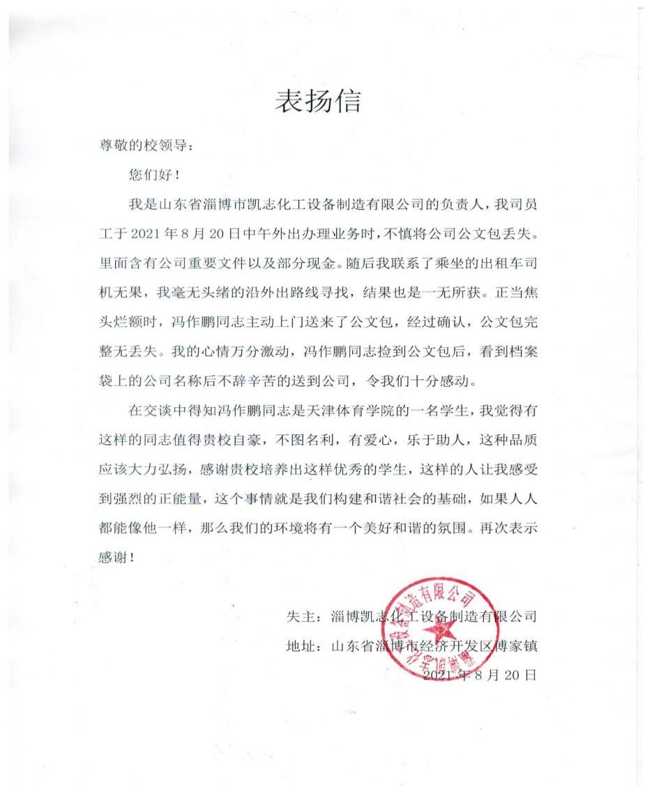 体育教学专业2019级研究生。2021年8月20日中午,他在山东省淄博市凯志化工设备有限公司员工办理业务路上捡到一个公文包,看到档案袋上的公司名称后立马主动联系该公司,并亲自送到公司归还失主。该公司负责人对比分网