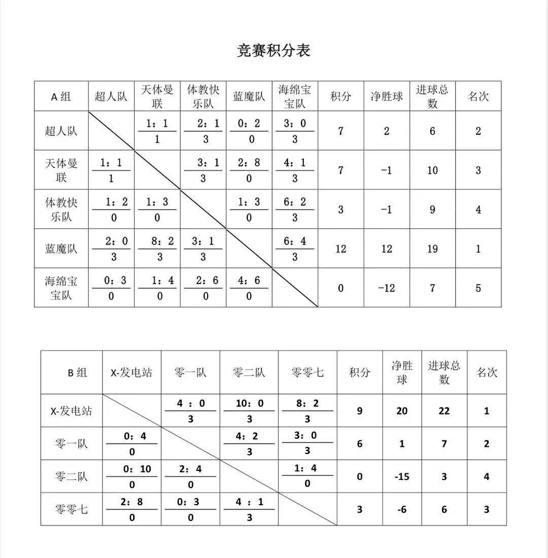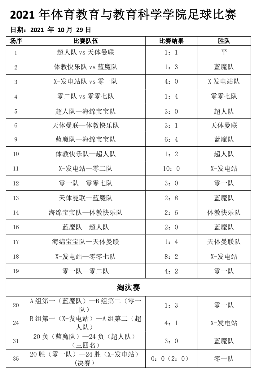 经过两周的激烈角逐,男子组共9支参赛队伍上演了20场精彩赛事。绿茵场上运动员们各显身手、积极跑动、顽强拼搏。其中A组 “蓝魔队”、“超人队”,B组 “X-发电站队”、“零一队”成功进入淘汰赛。体育教育与教育科学比分网