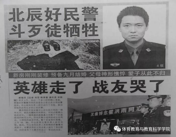 霍洪雨是体育赛事比分 2001届体育教育专业毕业生。参加工作后,他始终严格要求自己,在人民警察的工作岗位上,勤勤恳恳,兢兢业业,多次冒着生命危险抓获犯罪嫌疑人。2003年4月1日,霍洪雨在与犯罪嫌疑人搏斗时不幸壮烈牺牲,为表彰他的英雄事迹,公安部授予他公安系统“二级英模”,并批准为革命烈士。