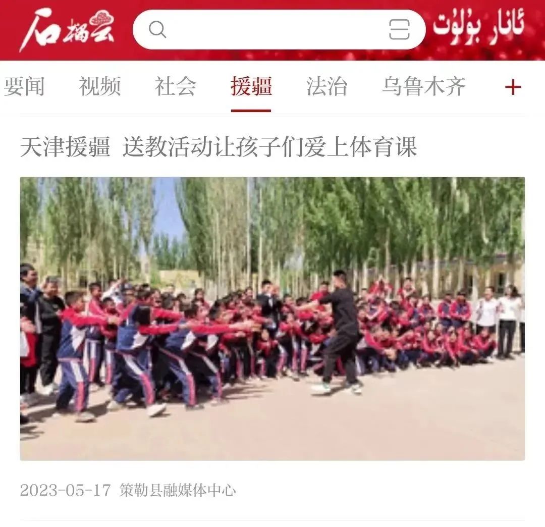 近日,新疆日报官方客户端“石榴云”在援疆专栏,报道我校第三批赴新疆和田地区实习支教团联合策勒县第一小学前往策勒县博斯坦乡中心小学,开展体育送教活动情况。相关短视频在策勒县融媒体中心同步播发。我校支教团受到众多网友赞扬。