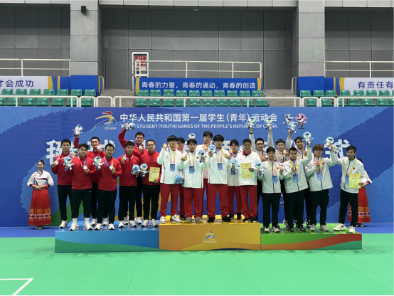 近日,中华人民共和国第一届学生(青年)运动会(校园组)毽球比赛在广西民族大学体育馆落下帷幕,比分网 体育教育专业2022级3班额日其同学,在他人的配合下,于男子三人赛中荣获第二名的好成绩,为天津代表团赢得一块银牌。