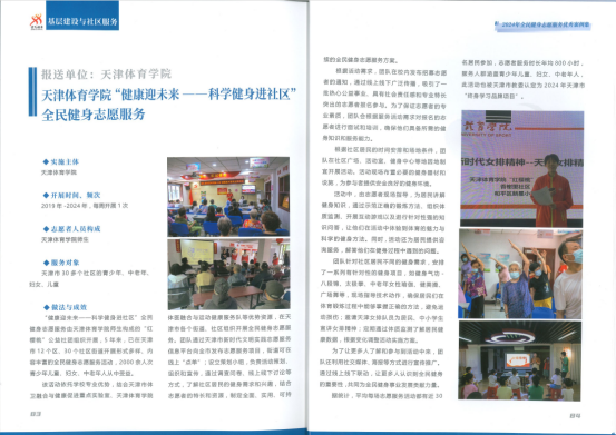 我校“健康迎未来——科学健身进社区”全民健身志愿服务,由学校师生志愿者组成的“红樱桃”公益社团组织开展。5年来,已在天津市12个区、30个社区街道开展女排精神宣讲、健身知识普及、体质检测,以及健身气功、中老年女性瑜伽、青少年防溺水、运动技能培训等形式多样、内容丰富的全民健身志愿服务活动,平均每场志愿服务活动均有近30名居民参加,2000余人次青少年儿童、妇女、中老年人从中受益。该项目也被天津市教委认定为2024年天津市“终身学习品牌项目”,获得2024年天津市青年志愿服务大赛优秀奖。下一步,我校团队将进一步发挥专业优势,深入拓展全民健身志愿服务理念、模式、内容,在为老服务、助残服务、乡村振兴、新时代文明实践等领域开展更多高水平的志愿服务。