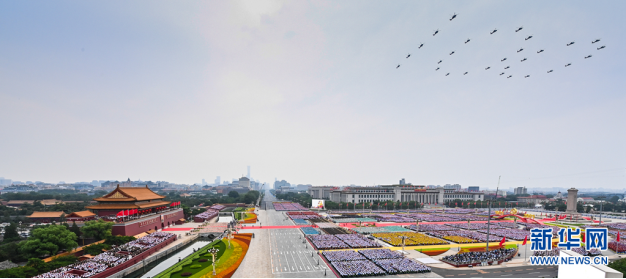 7月1日,庆祝中国共产党成立100周年大会在北京天安门广场隆重举行。习近平、李克强、栗战书、汪洋、王沪宁、赵乐际、韩正、王岐山、胡锦涛等出席大会。新华社记者 殷博古 摄 雄鹰翱翔,振翅长空。7时55分许,中国人民解放军71架战机飞向天安门广场,向党致敬,向祖国致敬,向人民致敬。空中护旗梯队拉开飞行庆祝表演序幕,5架直升机分别悬挂中国共产党党旗和写有“伟大的中国共产党万岁”“伟大的中国人民万岁”“伟大的中华人民共和国万岁”“全国各族人民大团结万岁”的条幅迎风向前。随后,直升机、战斗机分别组成“100”“71”字样掠过长空,15架歼-20飞机组成3个梯队呼啸而过,教练机拉出10道彩烟,精彩的表演激起一阵阵欢呼声。 天安门广场上的大型电子屏幕中出现了钟摆的画面。1921、1931、1941……2021,随着钟摆,年份数字依次显现。8时整,象征着巨轮启航的汽笛声响起,庆祝大会开始。