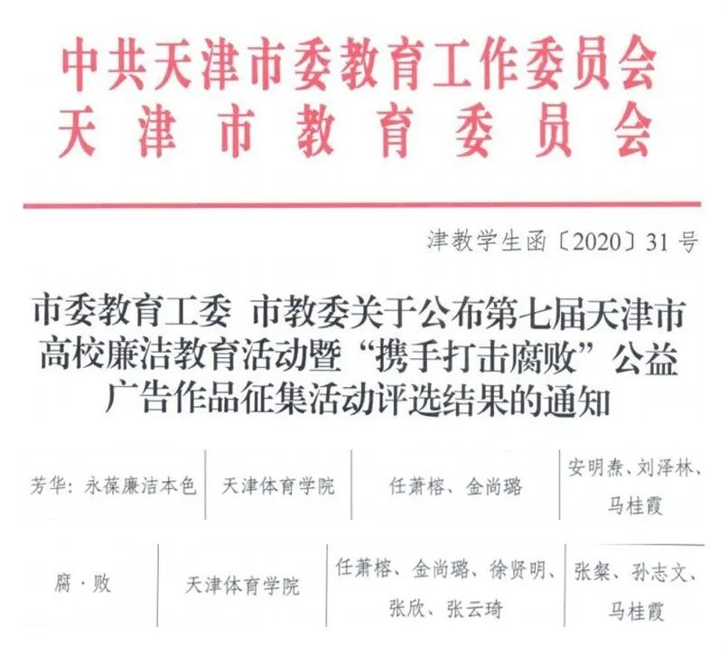 党委高度重视,在马桂霞书记、刘泽林副书记的指导下,任萧榕、金尚璐、徐贤明、张欣、张云琦等同学在第七届天津市高校廉洁教育活动暨“携手打击腐败”公益广告作品征集活动中以《腐·败》获得网络新媒体类作品的二等奖、任萧榕和金尚璐的《芳华:永葆廉洁本色》获得表演艺术类作品的二等奖。